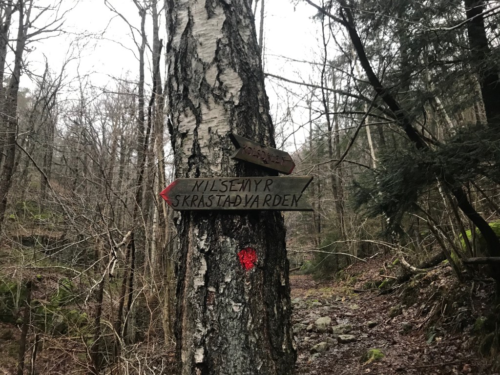 Da jeg kom til Nilsesmyr, tok jeg av mot Skråstadvarden. Her var det veldig gjengrodd, og ikke fant jeg merking av stien lengre. Stien var også delvis fraværende pga. mange veltede trær. Jeg rotet litt rundt for å finne stien, men fulgte retningssansen og bega meg oppover skråningen. Da jeg kom på toppen av Brennåsen, fant jeg rødmerkingen igjen, og da var jeg fornøyd. Til da på turen hadde jeg ikke sett et eneste menneske, så jeg følte jeg var et stykke utenfor allfarvei og hadde ikke så lyst å gå meg vill.