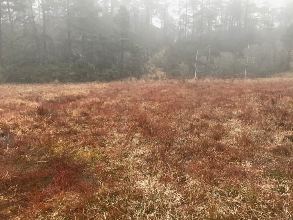 Stien flatet ut, og foran meg lå ei myr. Skulle jeg virkelig over den? Jeg måtte frem med kartet igjen, og den viste at jeg skulle over. I tåka kunne jeg skimte rødmerking på den andre sida, så dermed fant jeg stien greit igjen. Myra var ikke våtere enn at jeg kom meg tørrskodd over.