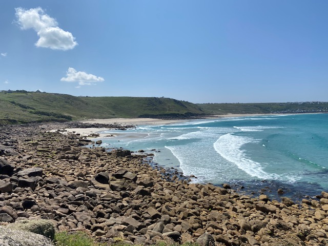 Onsdagen startet fint, med lett sekk og fint vær. Bussen tok oss til St. Just, og vi startet med å gå nedover og ut til Cape Cornwall som vi droppet forrige vandredag. Dessverre fant vi ikke cafeen der vi skulle hilse fra bibliotekaren før vi var langt forbi, så den muligheten gikk fra oss. Vi hadde ikke gått så lenge før vi kom til den enorme bukten Sennen Cove. Den bestod av flere strender, og det var tydelig et godt sted for surfere med lange grunner og store bølger. Det var drøyt å gå langs strendene, og da vi var nesten rundt, hadde vi lunsjpause, etterfulgt av kaffe og is på strandcafeen. Det var fristende å bare legge seg til i sola på stranda, men vi hadde fremdeles et stykke igjen å gå.