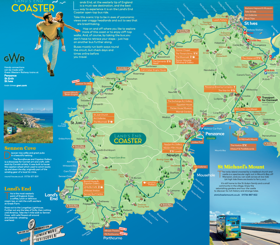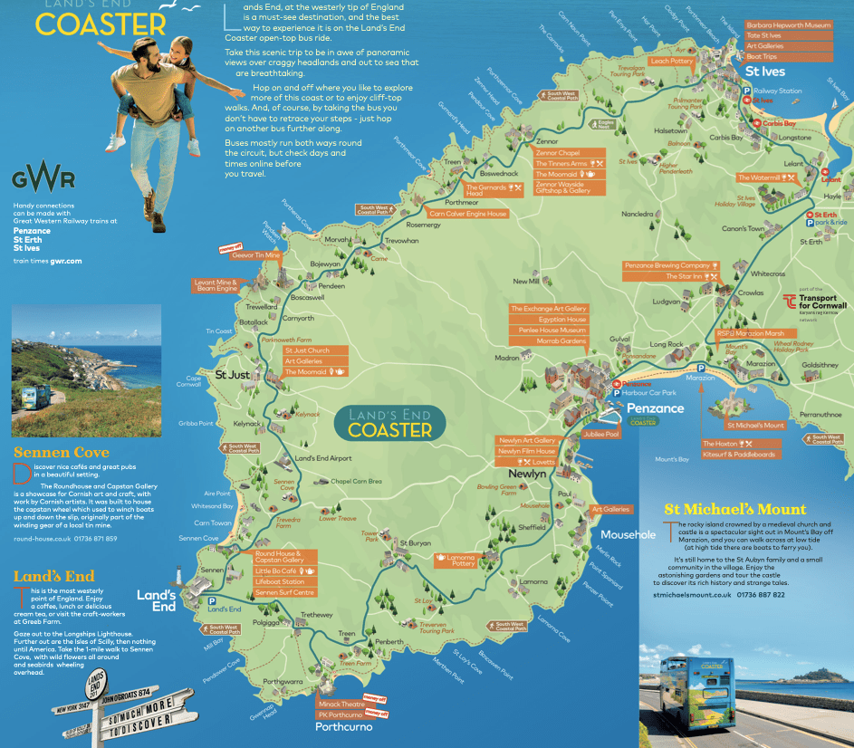 Nå var det bussen «Land`s End Coaster», en dobbeltdekker, tilbake til Penzance langs kystruten, en smal og svingete vei der det flere steder var umulig å passere motgående trafikk. Det var fascinerende å sitte i friluft på toppen; den som satt ytterst måtte passe seg for ikke å få litt bladverk fra trærne i fjeset, og hele bussen gispet litt når vi skulle gjennom en hårnålssving og måtte over i motsatt kjørefelt for å klare svingen.