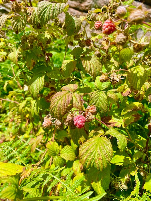 Utstyrt med gode sko, en plukkekopp og lange bukser, tok jeg en tur ut mellom regnbygene for å plukke bringebær. Det er ennå tidlig sommer, og få bringebær er modne, men på de mest solfylte stedene fant jeg nok bær til en porsjon syltetøy. Det finnes ikke noen bedre sommersmak enn smaken av nyrørte bær med sukker.