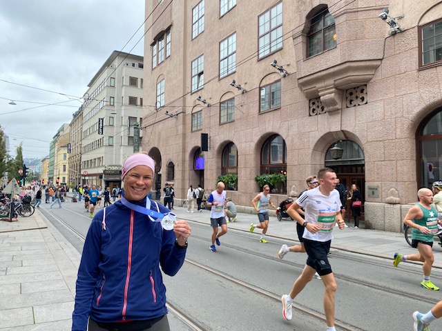 For 7 år siden løp jeg maraton i Amsterdam sammen med løpegruppa på jobb. Det var en stor opplevelse. I går gjorde jeg det samme igjen, denne gangen i Oslo. Og det ble stort denne gangen også! Jeg bestemte meg i april etter at mannen hadde signalisert at han kom til å bruke mye tid i sommer på sykling. Hva skulle jeg bruke sommeren på når han var på tur? Svaret ble løping, noe av det jeg trives best med, spesielt i sommerhalvåret. Jeg bestemte meg nok en gang for å følge planen i boka «Løp langt», slik jeg gjorde sist, men jeg var litt mer strukturert denne gangen og fulgte planen litt nøyere. Planen startet i juni, men jeg brukte også mai måned til noen langturer.