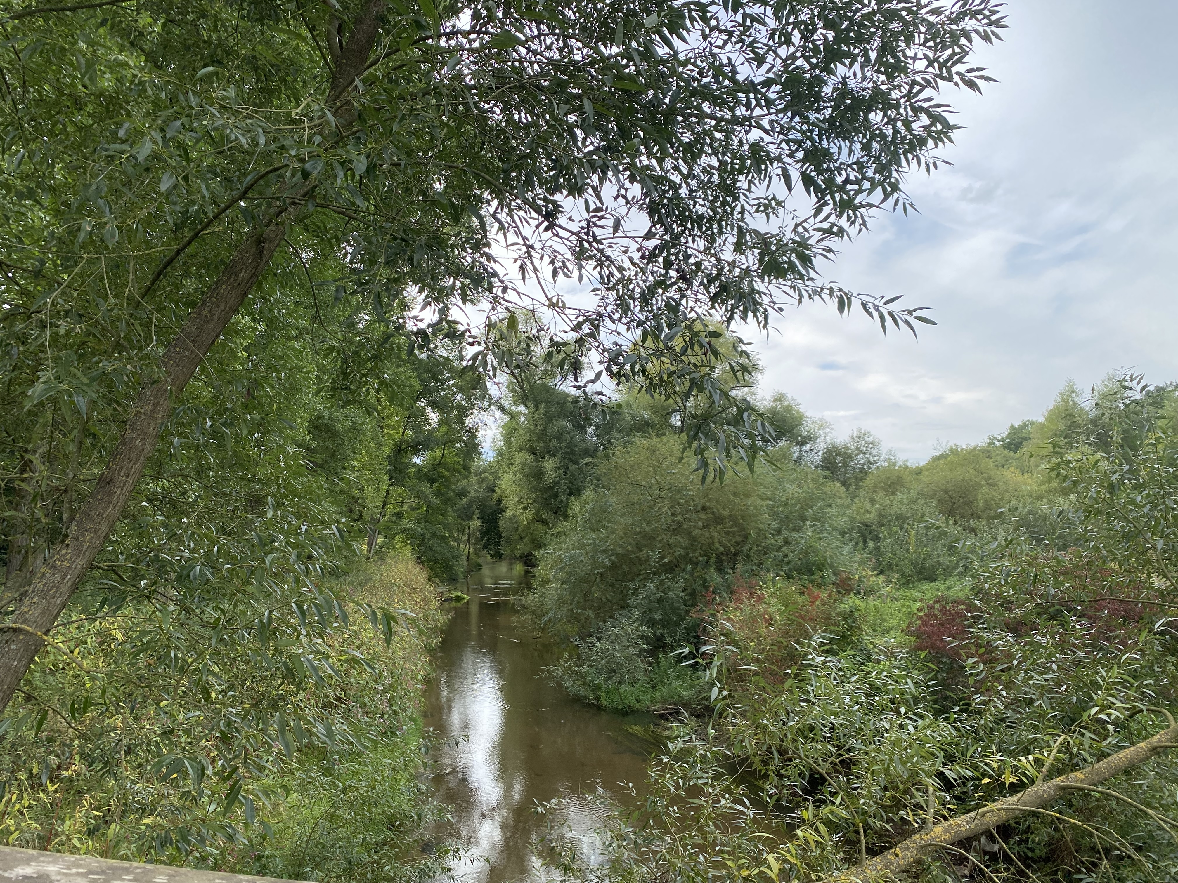 Dagens etappe gikk mye langs åker og eng. Det var maisåker etter maisåker, og kilometer etter kilometer med dyrket mark. Da vi skulle ha dagens lange lunsjpause, håpet vi stadig å finne en benk, men da vi hadde gått nærmere 3,5 timer, måtte vi sette oss på en veltet trestamme i stedet, for det var ikke noen benk. (Og ifølge min mann gikk det ikke an å ta pause før den planlagte tida. Han uttalte også at han var imot lange pauser!) Vi fikk spist og drukket godt, for det var varmt også denne dagen. Pausen ble ikke så lang siden det ikke var så godt å få hvile der, men 2 minutter etter at vi hadde begynt å gå igjen, kom vi til en benk. Typisk!