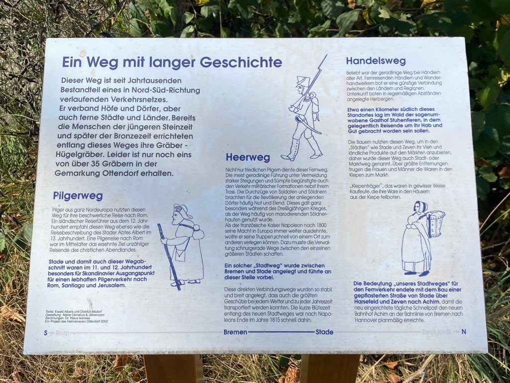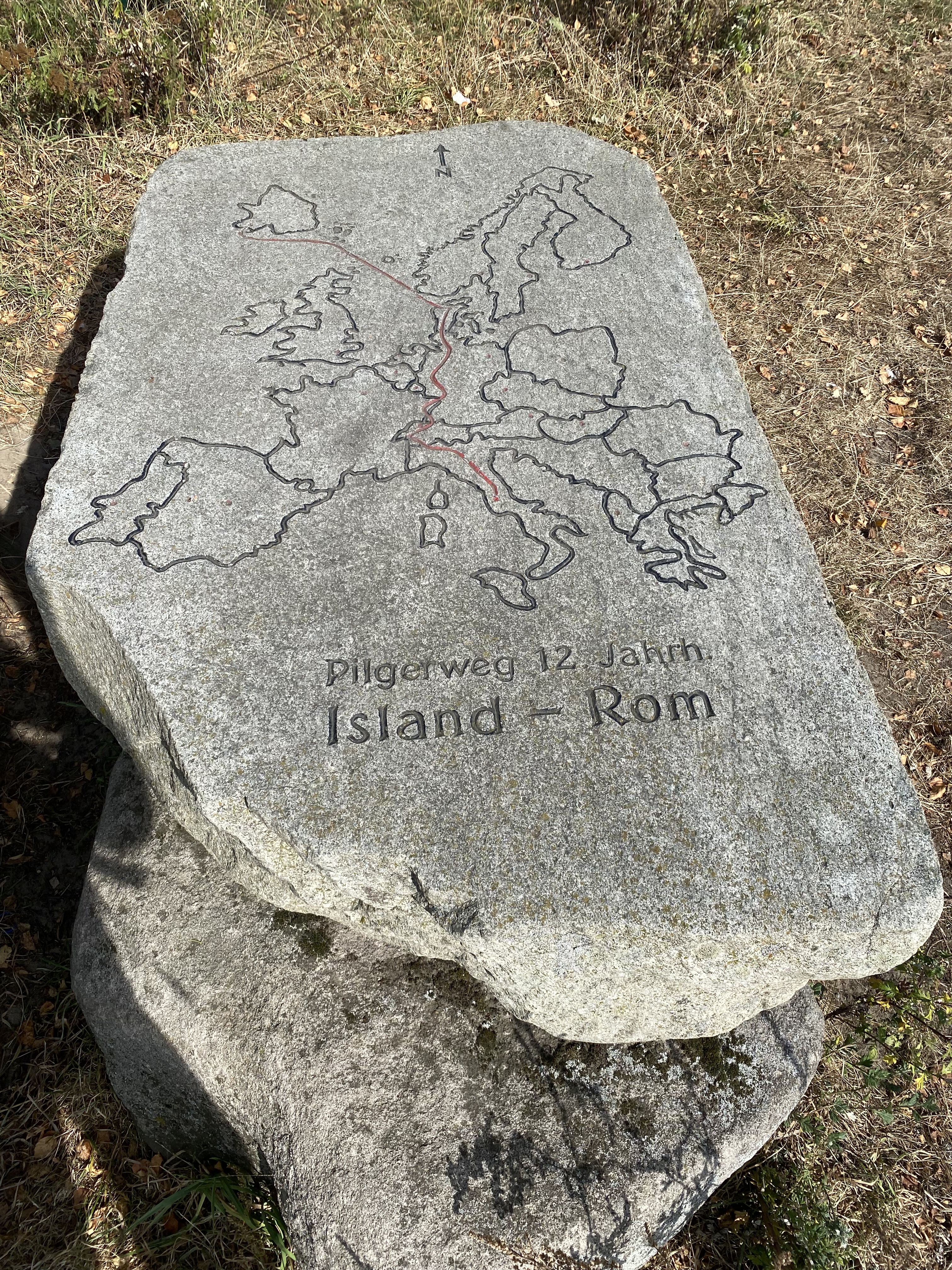 Pilegrimsleden Via Roma Germanica fulgte de første etappene samme vei som «Jakobsveien» som kommer fra de baltiske landene og går til Santiago de Compostela i Spania. Det var ofte tydeligere merking for Jakobsveien, med den gule kamskjell-logen som på bildet over. Denne dagen gikk vi også på Napoleonsveien, og i flere veikryss utenom byene var det svære steinbautaer som viste vei. Tenk at pilegrimer på 1200-tallet kom helt fra Island for å dra til Roma!