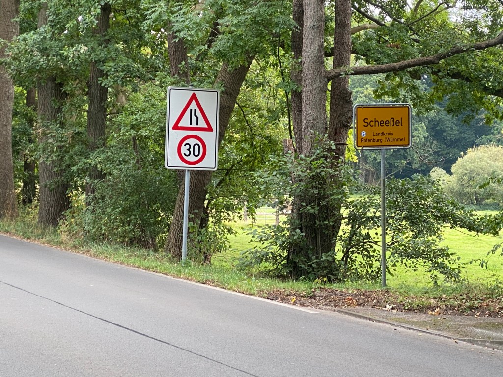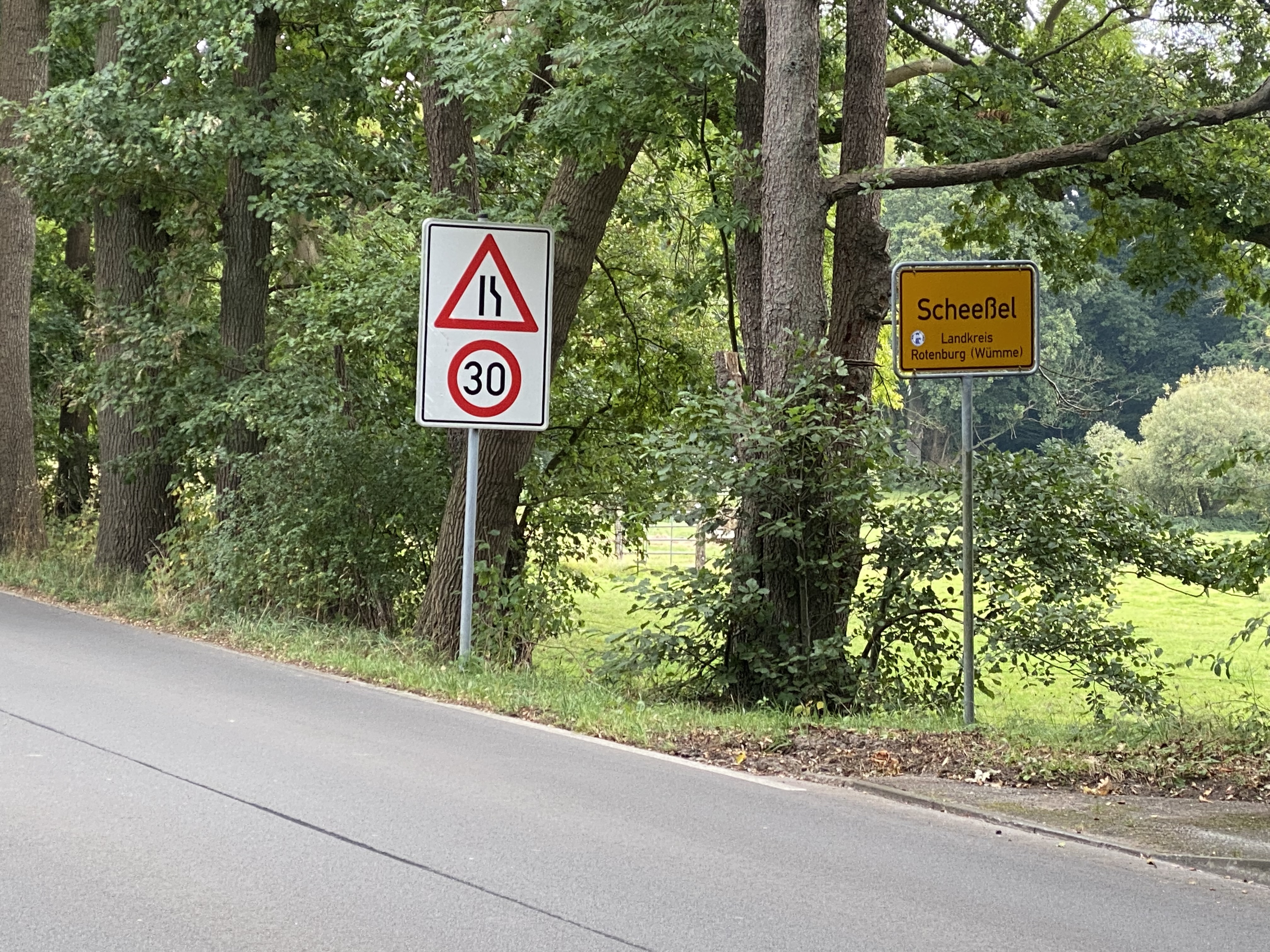 Vi nærmet oss byen, og innstillingen til vandringen endret seg. Når jeg først visste at vi snart var ferdige, kjente jeg utålmodigheten komme snikende. Det var liksom så langt inn til selve bykjernen…. Men vi kom frem til Schessel og satte oss på en liten cafe med god kaffe og mat og var fornøyd.