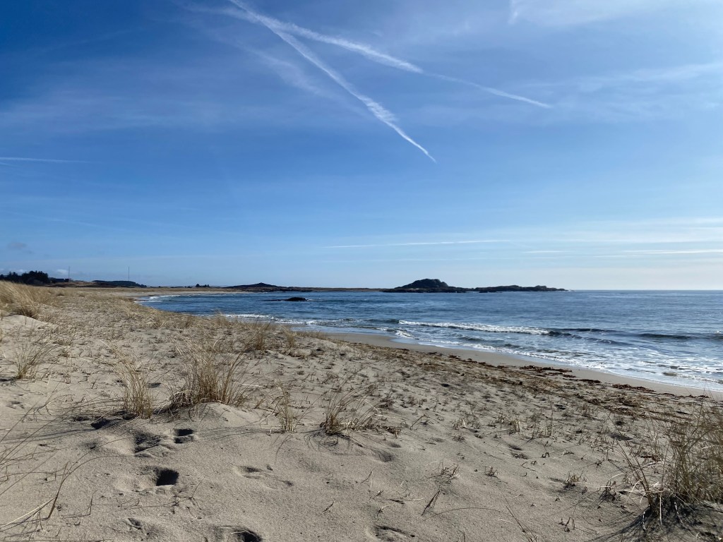 Etter frokost og nedrigging av «leiren», kjørte vi til Haviksanden på Lista. Der pakket jeg om og tok med litt mat og klær i en dagstursekk for å gå, mens mannen hadde sykkeltøy og tok sykkelen for å utforske området. Vi opplevde å være på Lista i omtrent vindstille vær og sol fra skyfri himmel. Helt fantastisk! Etter en halvtime, tok jeg en liten pause i sanddynene og la meg ned i en god stilling og bare nøt sola som varmet.