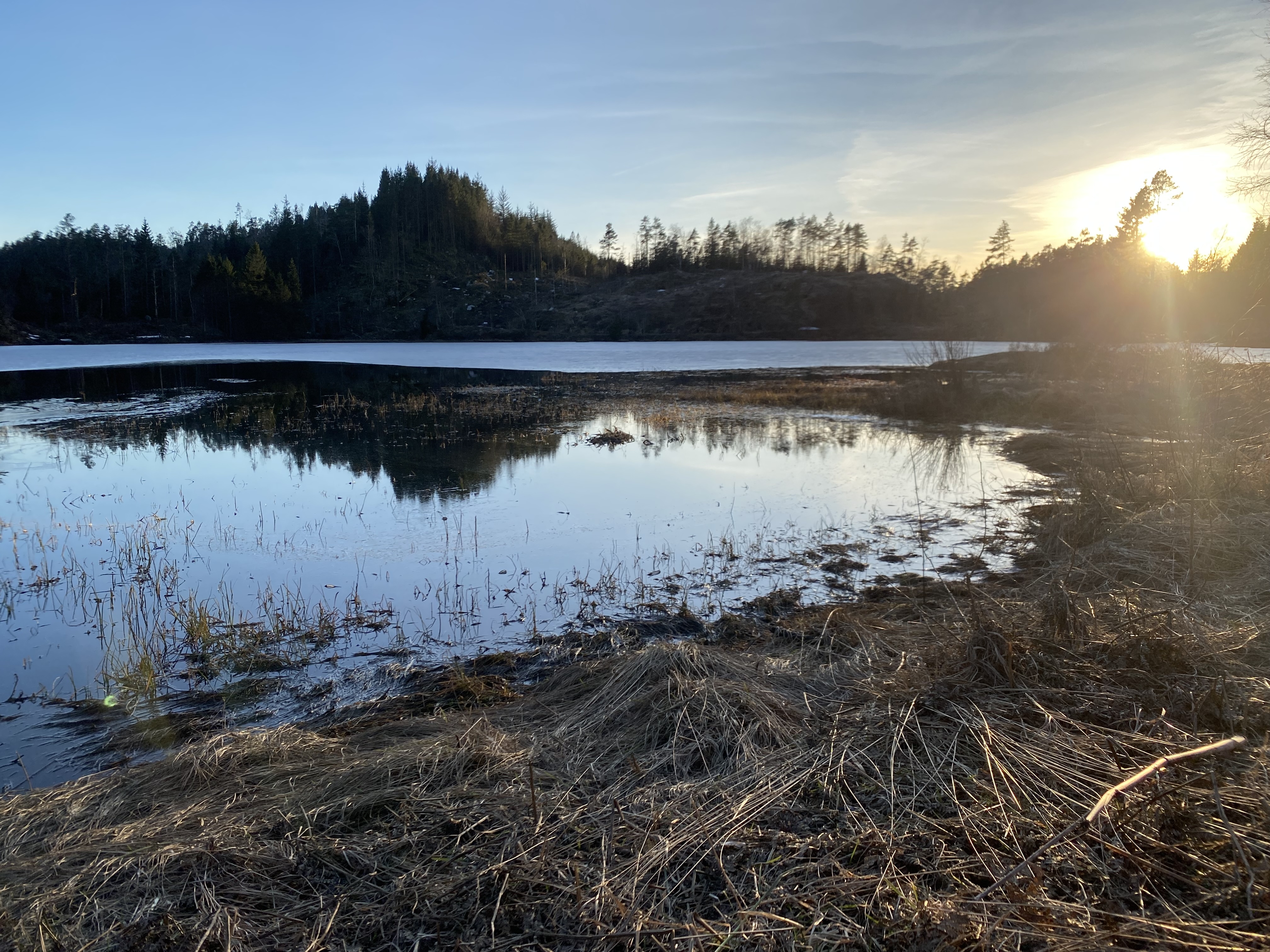Vi krøp i soveposen tidlig, og jeg brukte alt jeg hadde med for å isolere: To-tre liggeunderlag, noen sitteunderlag inni soveposen, fleecepose inni soveposen, dunjakka nedi posen i tilfelle bruk for den senere, og lue og votter på. Jeg lå og bekymret meg litt for å fryse, men klarte etterhvert å slappe av med tanken på at jeg skulle ha mulighet for å holde meg varm, og om ikke annet, kunne jeg bruke bilen og sette på varme der. Jeg sov veldig lett og var våken mange ganger gjennom natten, men det var ikke så farlig. Rundt kl. 7 måtte jeg opp på do, og da fristet det ikke å legge seg igjen. Jeg fyrte opp med kvist i kvistbrenneren, og kokte vann til kakao. Det var helt lyst, men rim på teltduken og is på vannskorpa. Etterhvert kom sola over åsen og ga litt varme, men jeg måtte holde kvistbrenneren med brensel hele tiden for å kunne varme fingre og tær. Det var gøy å kunne servere småbrødrene fra panne på kvistbrenneren til min kjære. Ferske «rundstykker» til frokost, bakt med bakepulver. (Omtrent som pinnebrød, bare pannebrød?)