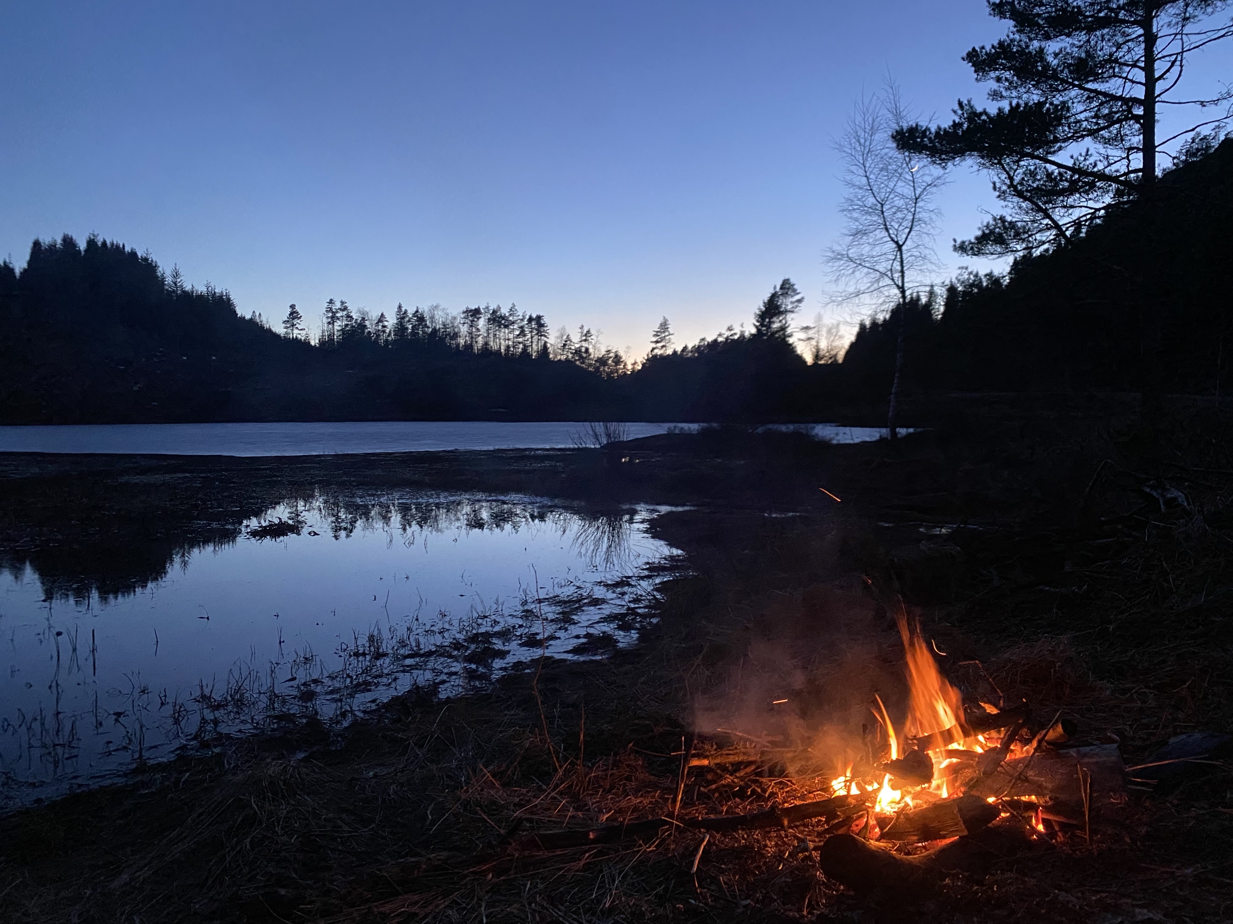 Vi rakk både å få opp teltet og klargjøre soveposer og underlag og å lage middag på primusen og spise den, før sola gikk ned. Det var nesten ikke vind, og vi nøt de siste varmende strålene fra sola. Og så var det bare å få laget bål og holde liv i det for å kunne sitte ute videre utover kvelden. Temperaturen falt raskt, og det var nok bare 1- 2 grader da klokka ble 21 og bålet var for lite til å holde oss varme.